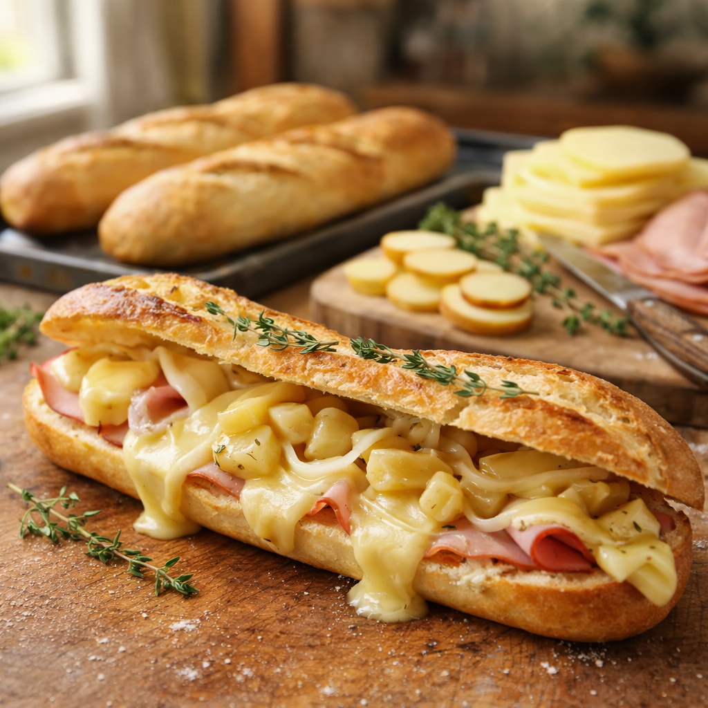 Des baguettes croustillantes garnies de pommes de terre fondantes, d’oignons dorés, de jambon et de fromage à raclette gratiné. Une recette simple, conviviale et ultra réconfortante parfaite pour un dîner rapide.