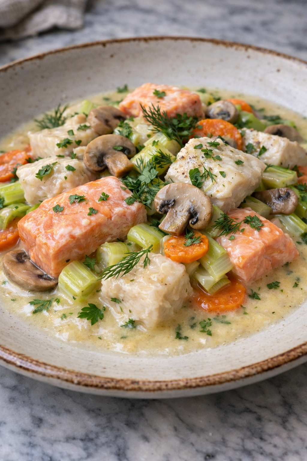 Une blanquette de poisson fondante et savoureuse, cuisinée dans une sauce onctueuse à base de crème et de fumet de poisson, idéale pour un plat principal délicat et gourmand.