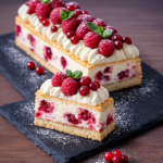 Bûche sans cuisson élégante et facile, composée d’une mousse mascarpone vanillée, d’un cœur framboise acidulé et d’une base biscuitée croquante. Idéale à préparer à l’avance pour un dessert de fête sans stress.
