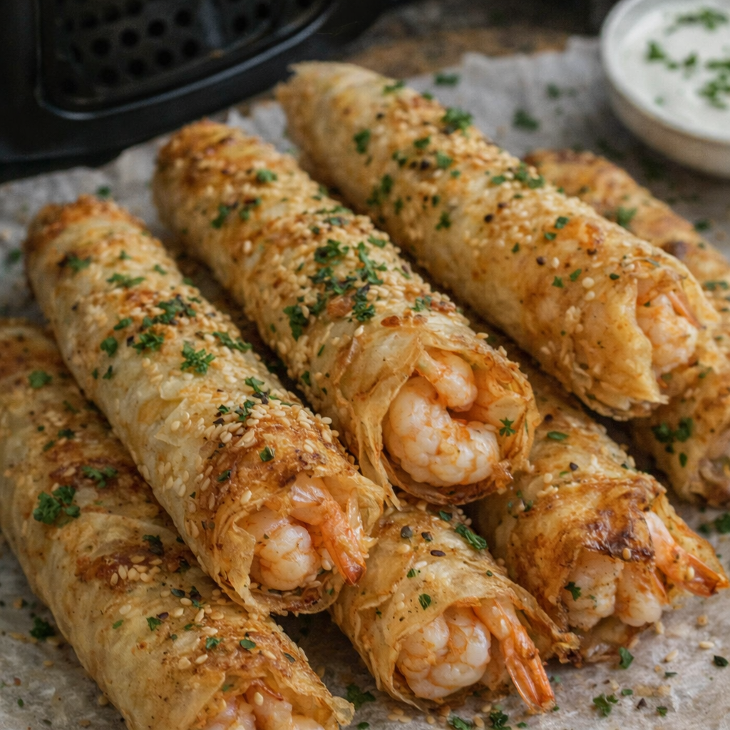 Cigares croustillants garnis de crevettes parfumées à l’ail et aux herbes, parfaits pour l’apéritif ou en entrée chaude.