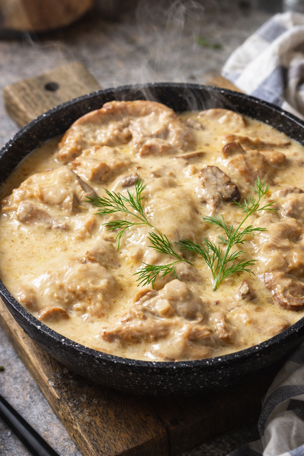 Ajoutez la crème et la poule découpée en morceaux puis laissez mijoter doucement.
