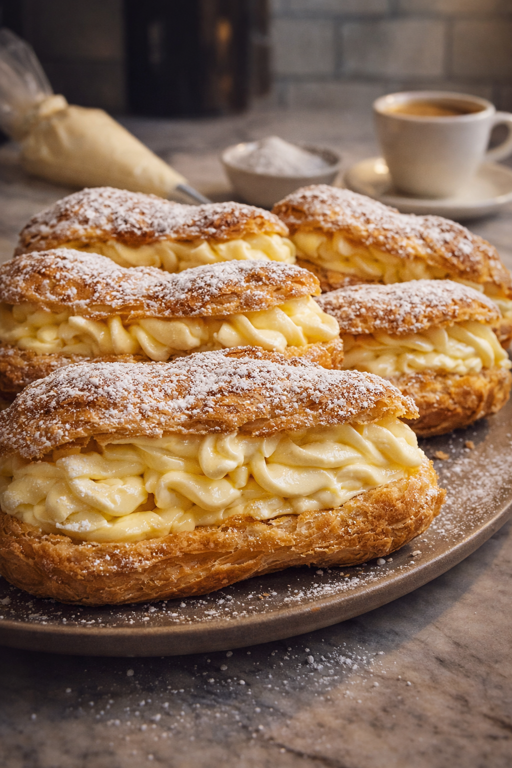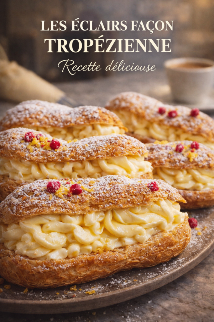 Des éclairs inspirés de la célèbre brioche Tropézienne, garnis d’une crème onctueuse à la vanille et au zeste d’agrume, pour un dessert français gourmand et irrésistible.