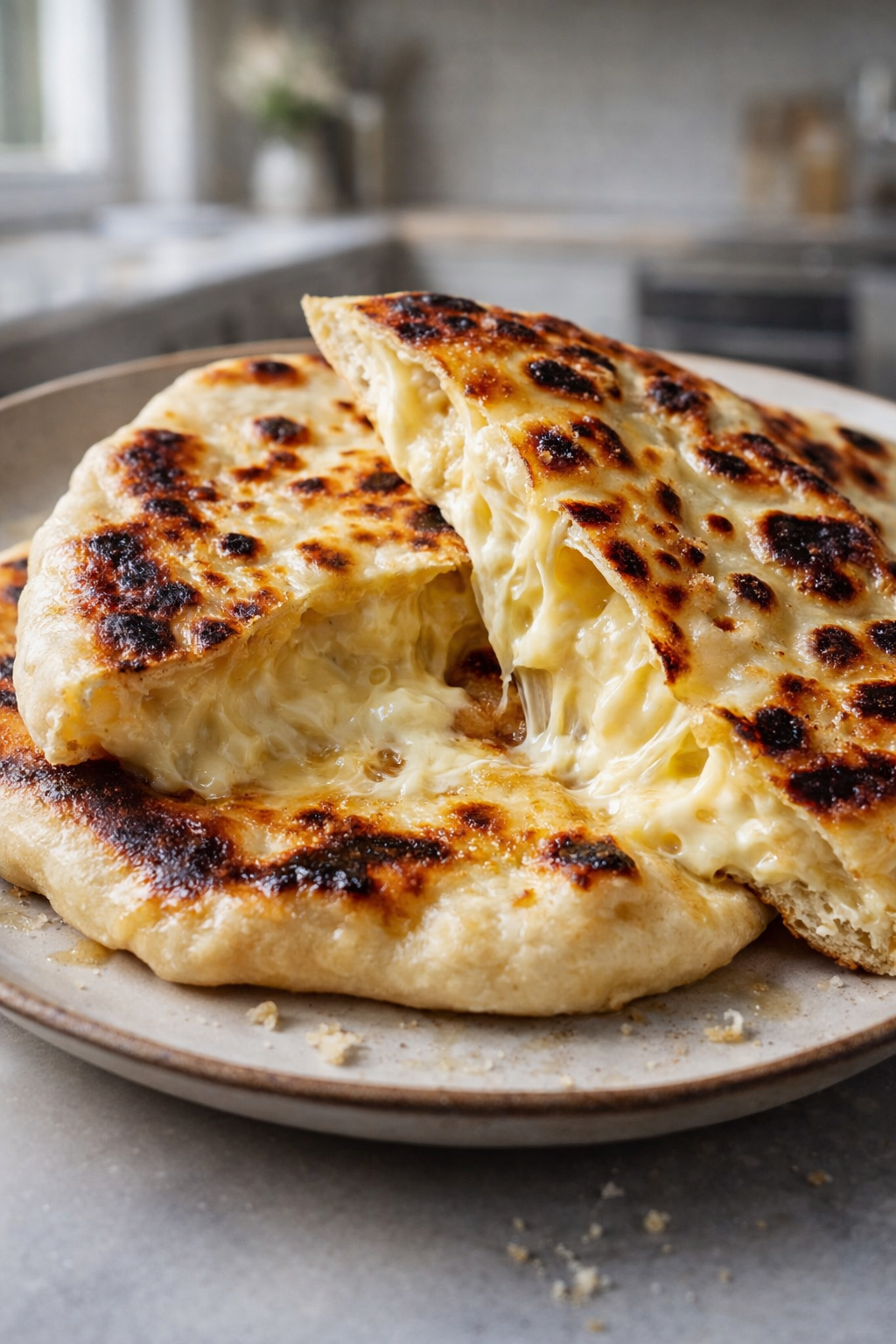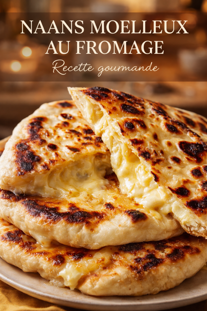 Les naans moelleux au fromage sont des pains indiens plats et tendres, garnis de fromage fondant. Ils sont parfaits pour accompagner des currys ou être dégustés en snack.