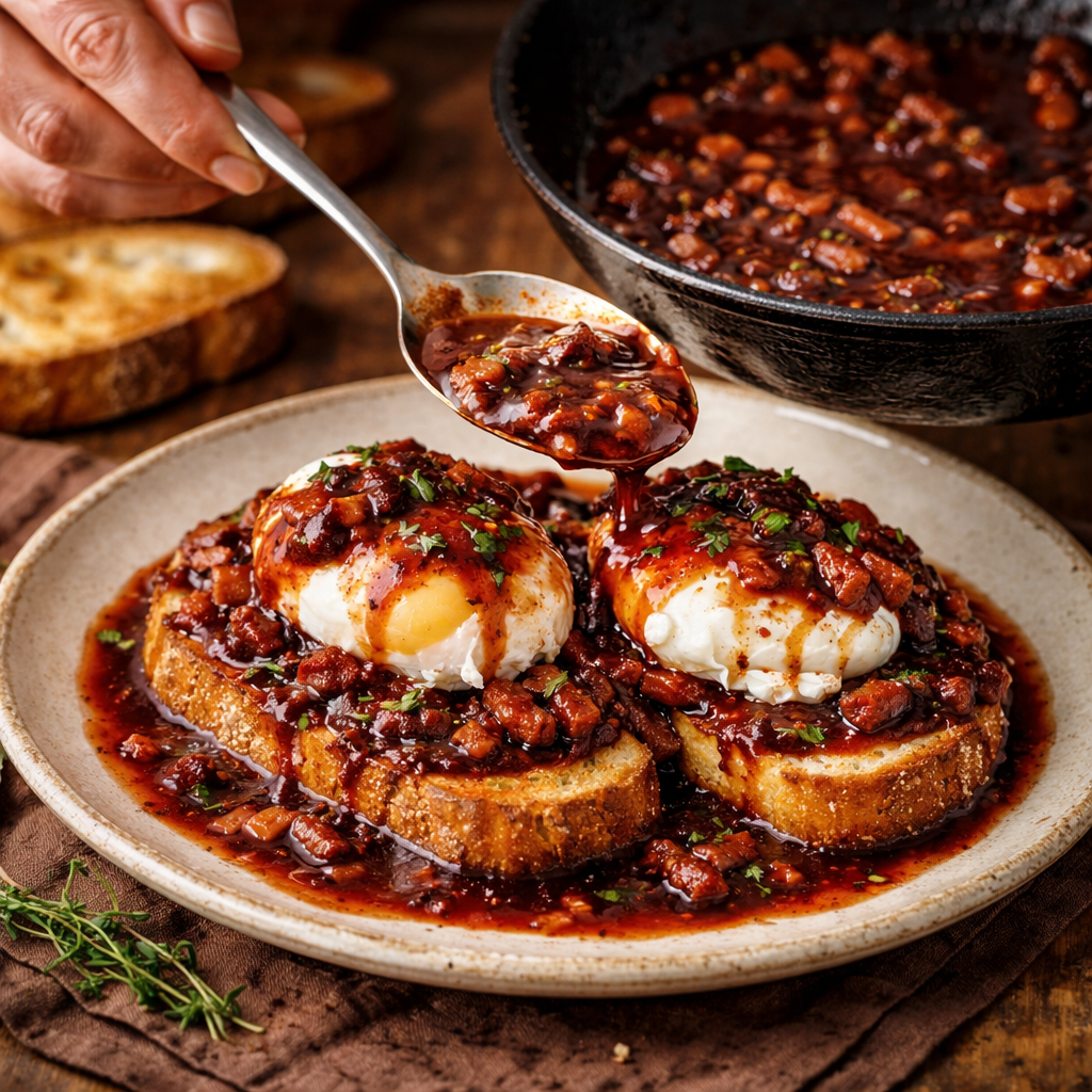Ensuite, couvrez tout avec de la sauce au vin rouge onctueuse. Ce plat traditionnel devient encore plus attrayant avec la sauce qui recouvre l’œuf et le pain.
