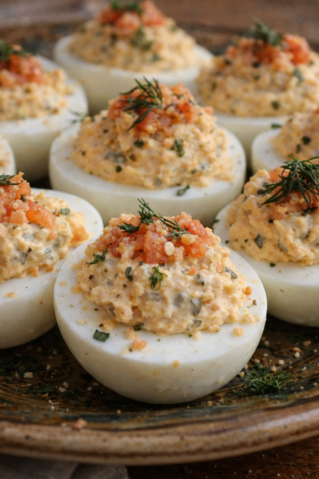 L’ajout de saumon fumé ou de thon à la recette traditionnelle des œufs mimosa introduit une complexité et une richesse qui élèvent le plat. Le saumon fumé, avec son goût intense et sa texture délicate, se marie parfaitement avec la farce crémeuse.