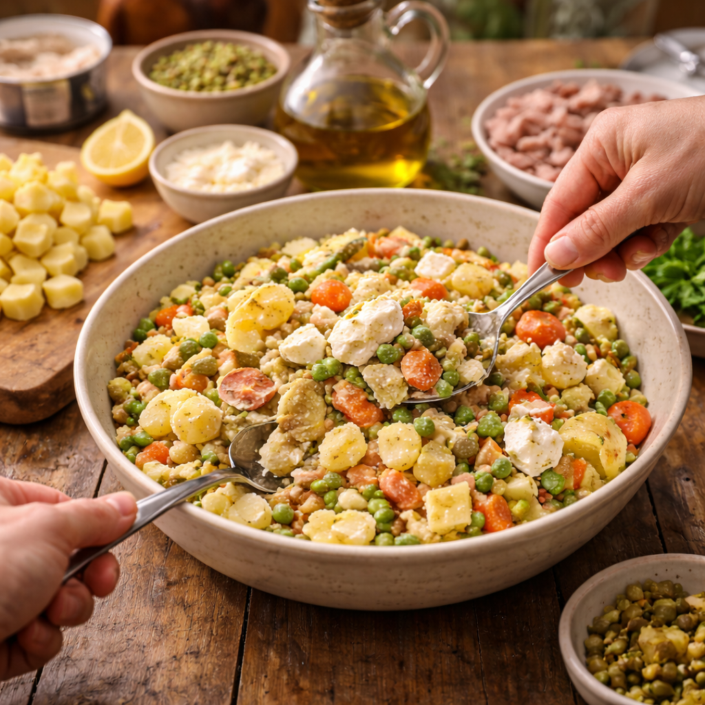 La magie opère véritablement lors de l’assemblage final de votre préparation. En suivant ces étapes salade russe avec soin, vous transformez des ingrédients simples en un plat raffiné et gourmand.