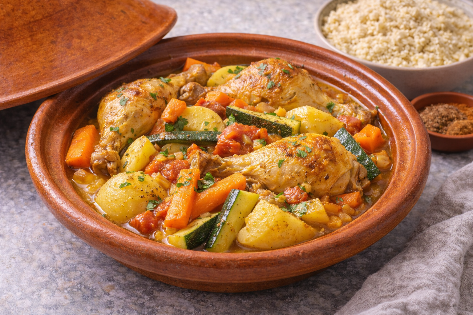 La magie du tajine vient de son récipient en terre cuite. Sa forme conique permet une cuisson lente. Cela garde le poulet tendre et intensifie les arômes des épices.