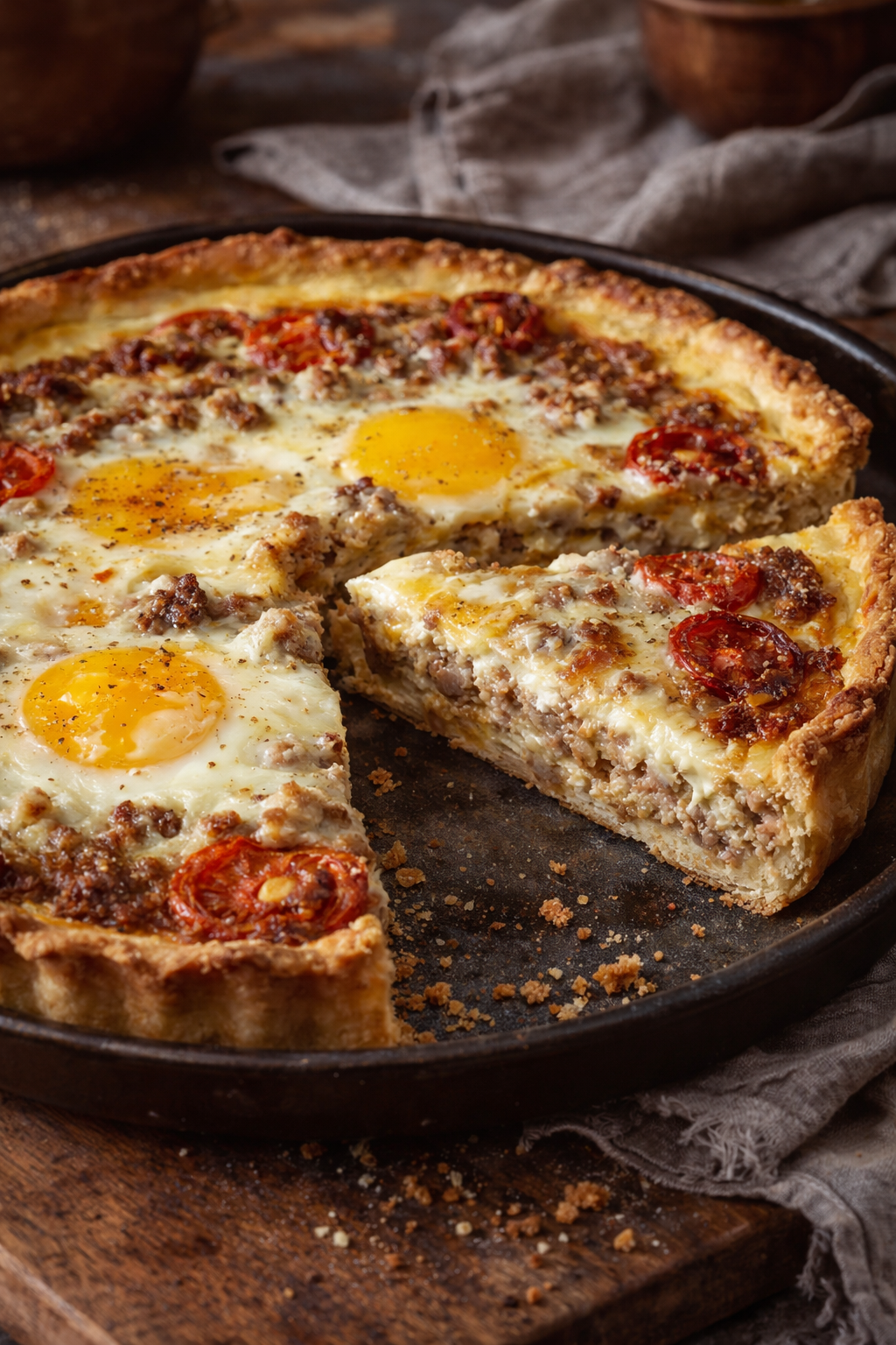 Une tarte salée généreuse et complète, avec une pâte brisée IG bas maison et une garniture fondante à la moutarde, oignon, viande hachée, tomate, mozzarella, fromage râpé et œufs, avec une finition originale aux jaunes déposés à la sortie du four.