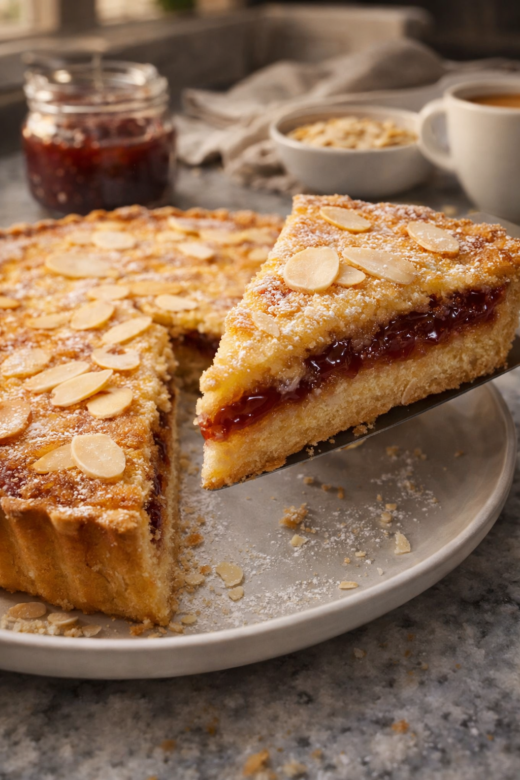 Une tarte amandine fondante garnie de confiture fruitée et d’une crème aux amandes onctueuse. Un dessert classique de la pâtisserie française, parfait pour accompagner un café ou conclure un repas en douceur.