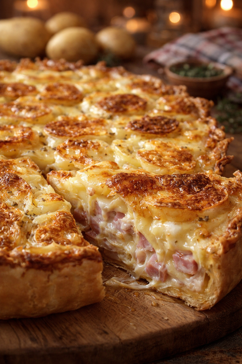 Les ingrédients principaux sont le fromage à raclette, les pommes de terre, le jambon et la pâte brisée.