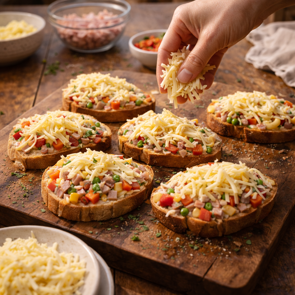 Sortez vos créations du four dès que le pain devient croustillant. Servez immédiatement pour profiter pleinement du contraste entre le pain chaud et le fondant des ingrédients.