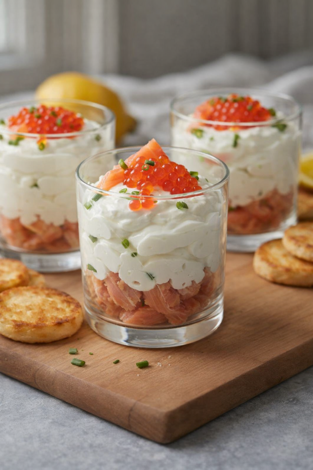 Pour impressionner, mettez vos préparations dans des contenants transparents. Servez-les avec des blinis ou des toasts. Ajoutez de la ciboulette et des œufs de lump pour plus de luxe.